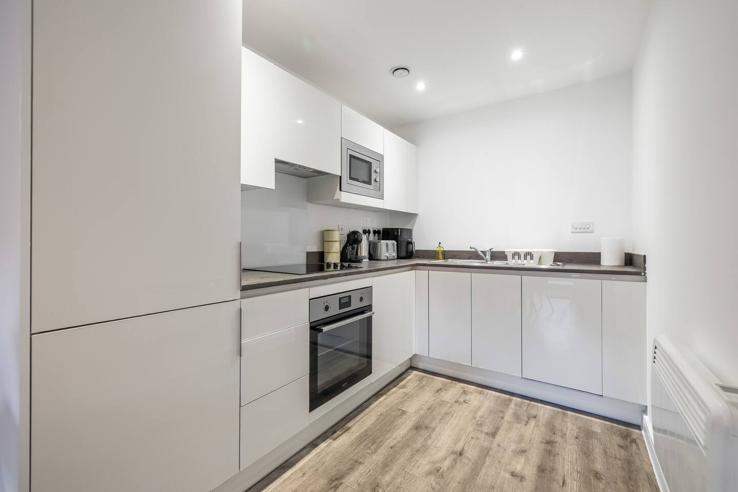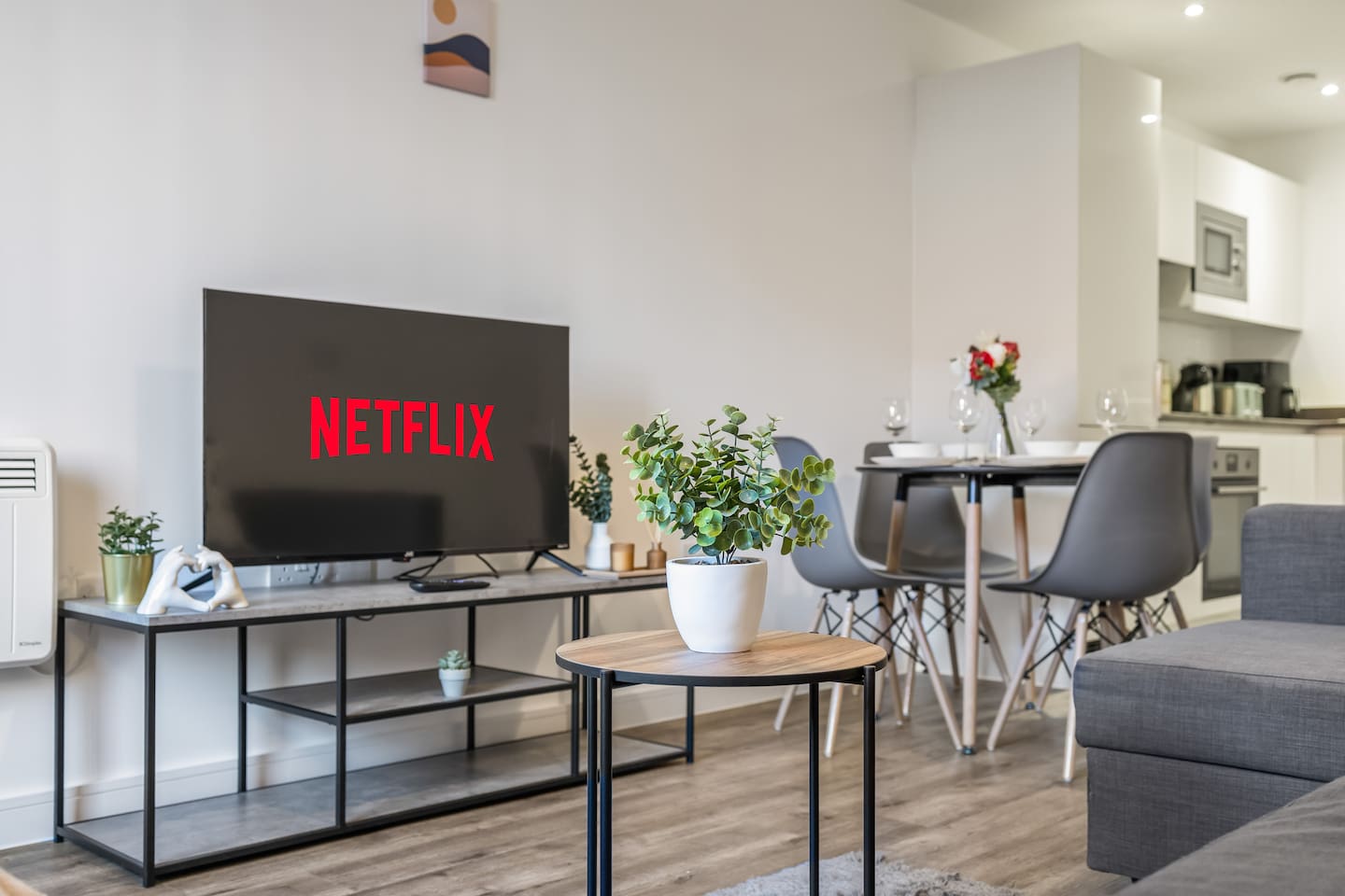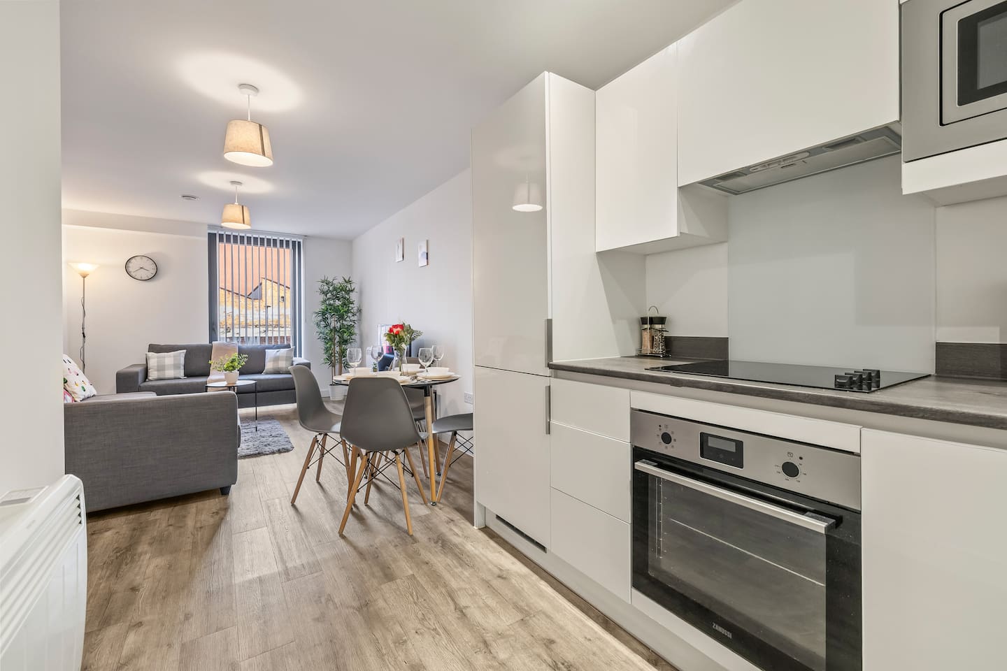 Welcome to your home away from home in the heart of Digbeth — Birmingham’s most creative and vibrant neighbourhood. This modern and spacious one-bedroom apartment offers a perfect blend of comfort and style, ideal for couples, friends, or business travellers looking to explore the city. The apartment features an open-plan living and dining area with large windows that flood the space with natural light. Relax on the luxurious king-size sofabed, enjoy your favourite shows on the smart TV, or gather around the dining table for a meal or a bit of remote work. The fully equipped kitchen has everything you need for a comfortable stay — including an oven, hob, microwave, fridge-freezer, and all cookware and utensils. You’ll also find complimentary tea, coffee, and a coffee machine to start your mornings right. The bedroom offers a cozy retreat with fresh bedding and soft towels provided. The modern bathroom includes a power shower and high-quality fittings for a refreshing start or end to your day. Other amenities include high-speed Wi-Fi, a washer/dryer, and all the essentials for short or long stays. Located just minutes from the Bullring Shopping Centre, the Custard Factory, and Birmingham city centre, you’ll be surrounded by independent cafes, bars, restaurants, and street art — everything that makes Digbeth one of the city’s most exciting areas. Whether you’re here for business or leisure, this stylish apartment is the perfect base to relax, recharge, and experience the best of Birmingham.