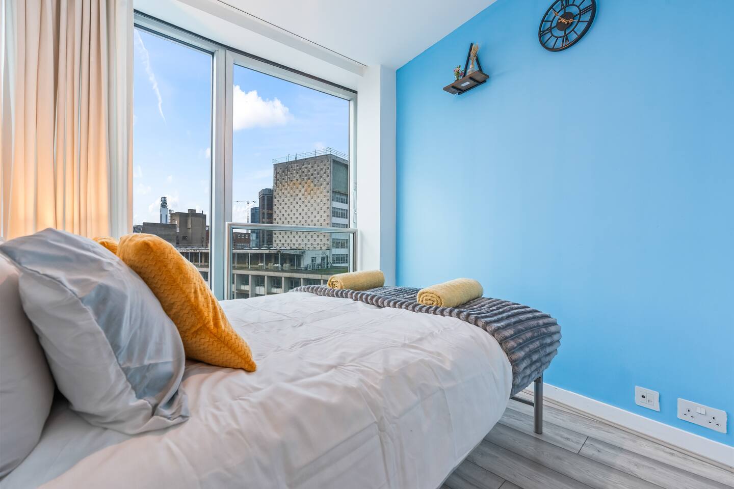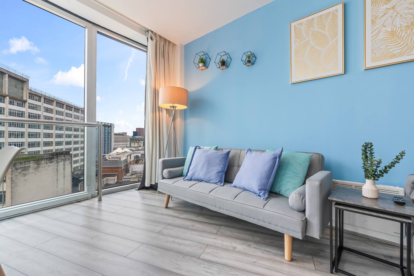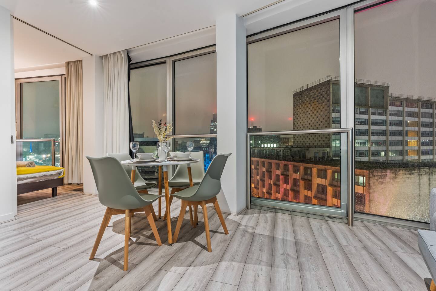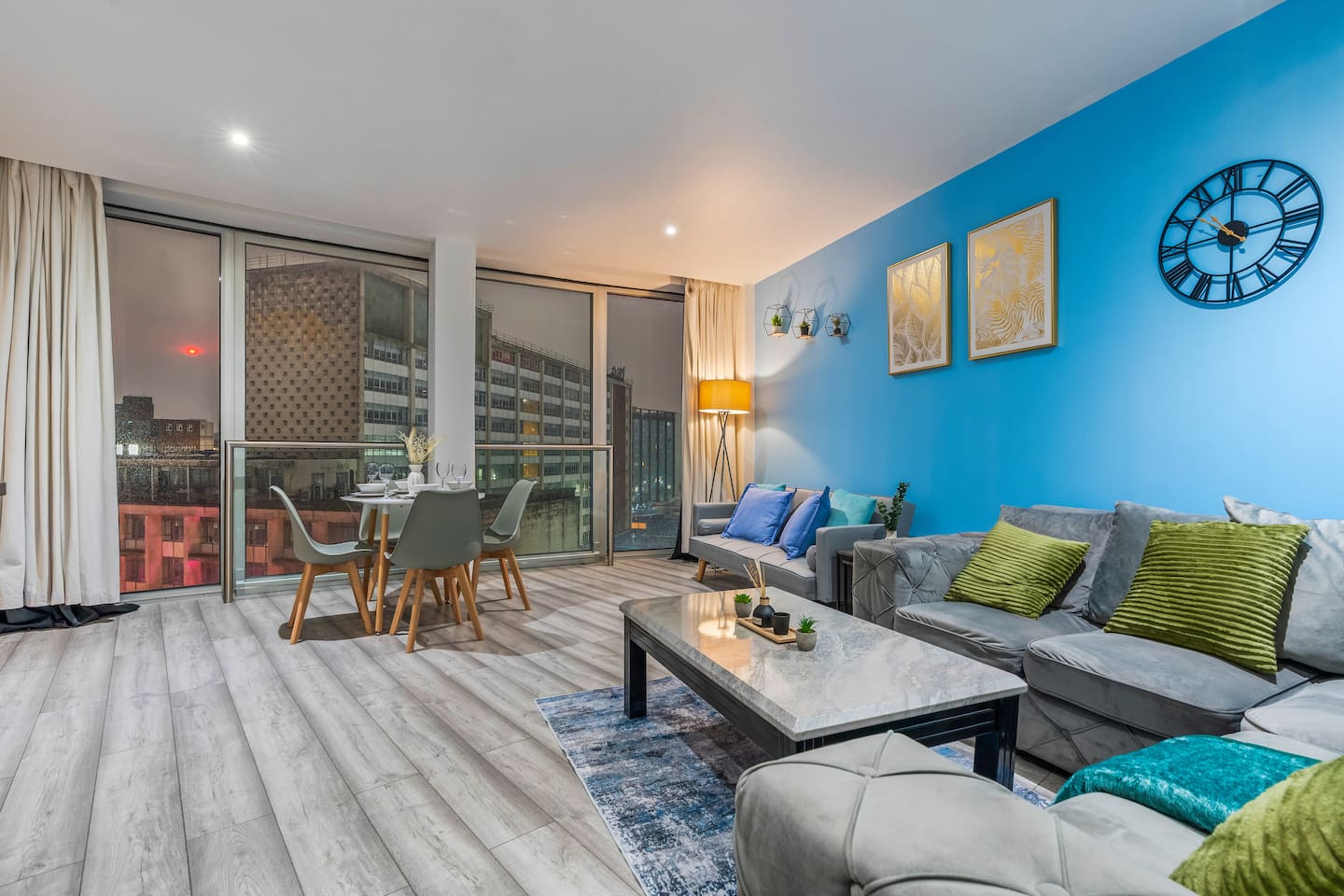 💰Looking for discounts? Please follow the instructions on the green picture for more information 📍 New Street ( Grand Central ) 5 minutes walk Moor Street Station 4 minute walk 🏠Airbnb are proud to present this simply stunning,2 bedroom 2 bathroom apartment, sleeps 6 in The famous Rotunda. Ideal for travelling professionals and families who desire a home away from home feel with a touch of uniqueness to their getaway! 🔐KeyNest self check in for your convenience. 🛏️The large bedrooms with floor to ceiling windows overlooking the vast Birmingham skyline, boasts a luxury king sized bed made up with crisp linen and clothes storage. Attached to the en-suite with a beautiful power shower over the deep bath calls for relaxation with a spa like experience. 📺The open plan living room caters for all TV entertainment fans where guests can enjoy Netflix, Prime TV plus many more streaming services. The large sofa bed folds for an extra two guests. 👨🍳The kitchen, with fridge freezer, electric hob and oven is complete with everything you’ll need to cook your favourite meals to enjoy around the kitchen island or dining table overlooking the city.
