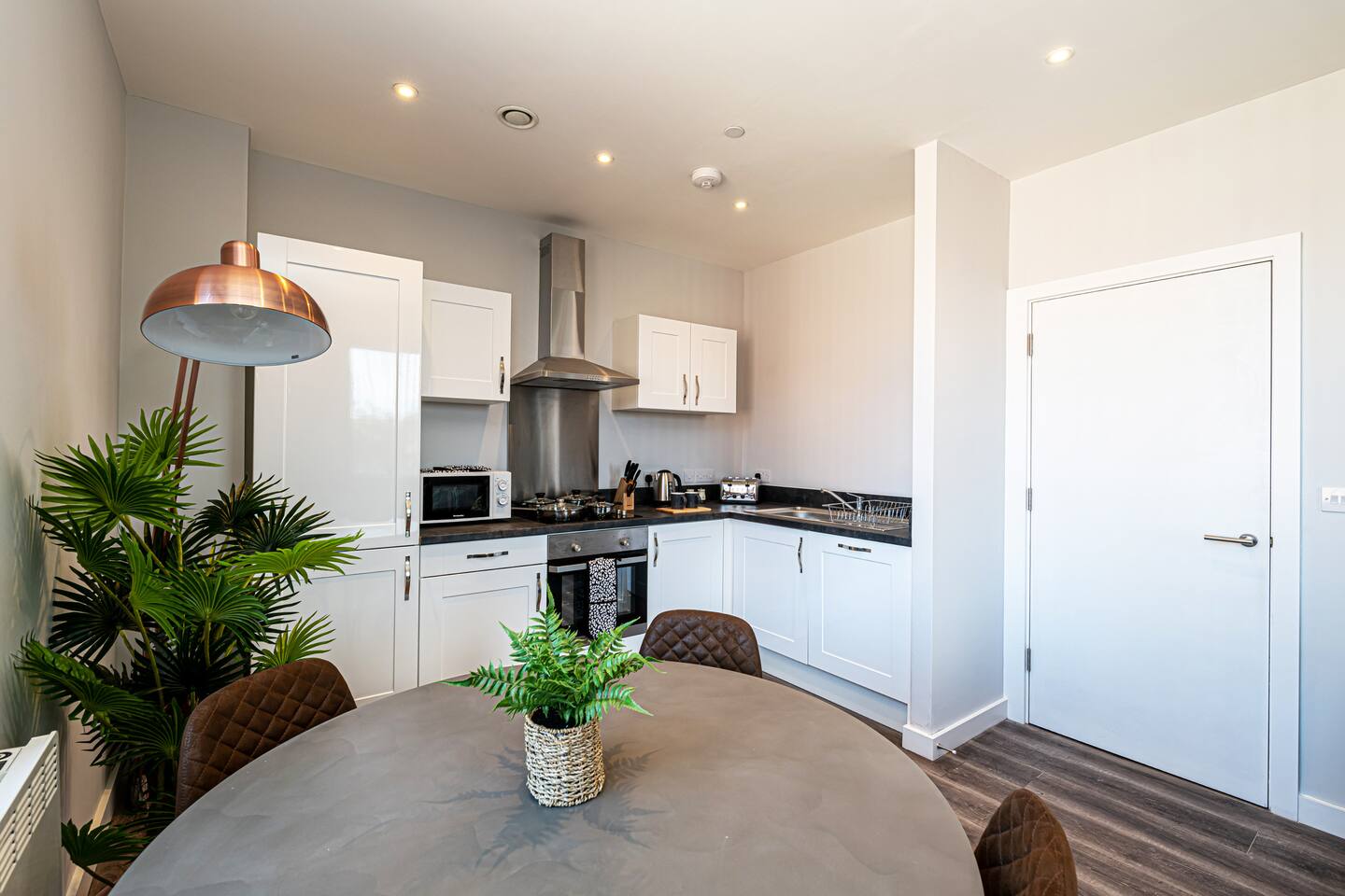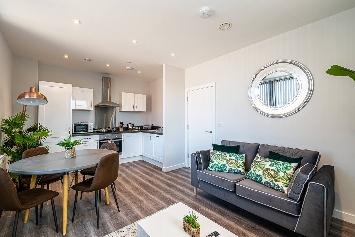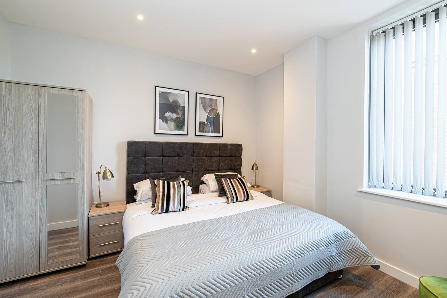 Crosby Gardens Apartment has a beautiful and bright open plan living, kitchen and dining room. The living area boasts carefully selected artwork and pottery to create a warm space. There is plenty of room to sit comfortably with two velvet sofas and an armchair. In the evenings it's the perfect spot to cosy up and watch your favourite shows on the large smart TV. Offering free onsite parking, a convenient lift access and concierge service, you'll love this location and space! After preparing a meal in the modern, well-equipped kitchen, guests can sit around the dining table and socialise with loved ones. There are two generous bedrooms in the apartment offering lots of space and stylish touches. Both bedrooms can be made into a superking sized bed, or two single beds offering convenient options for larger groups.