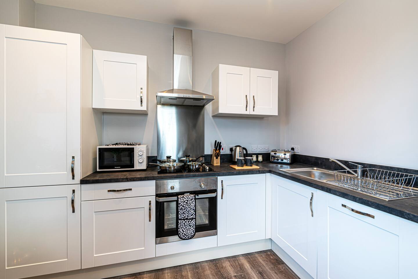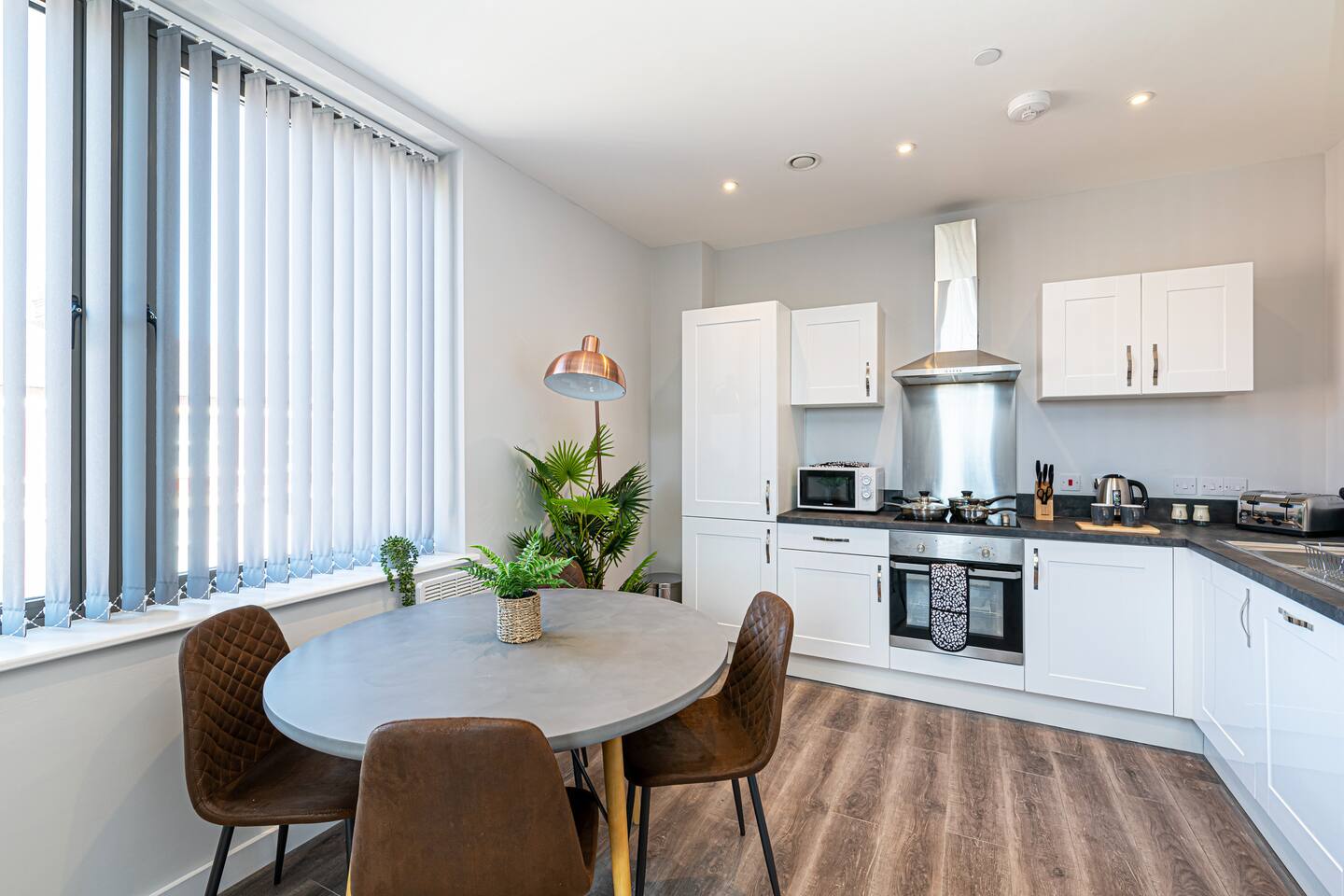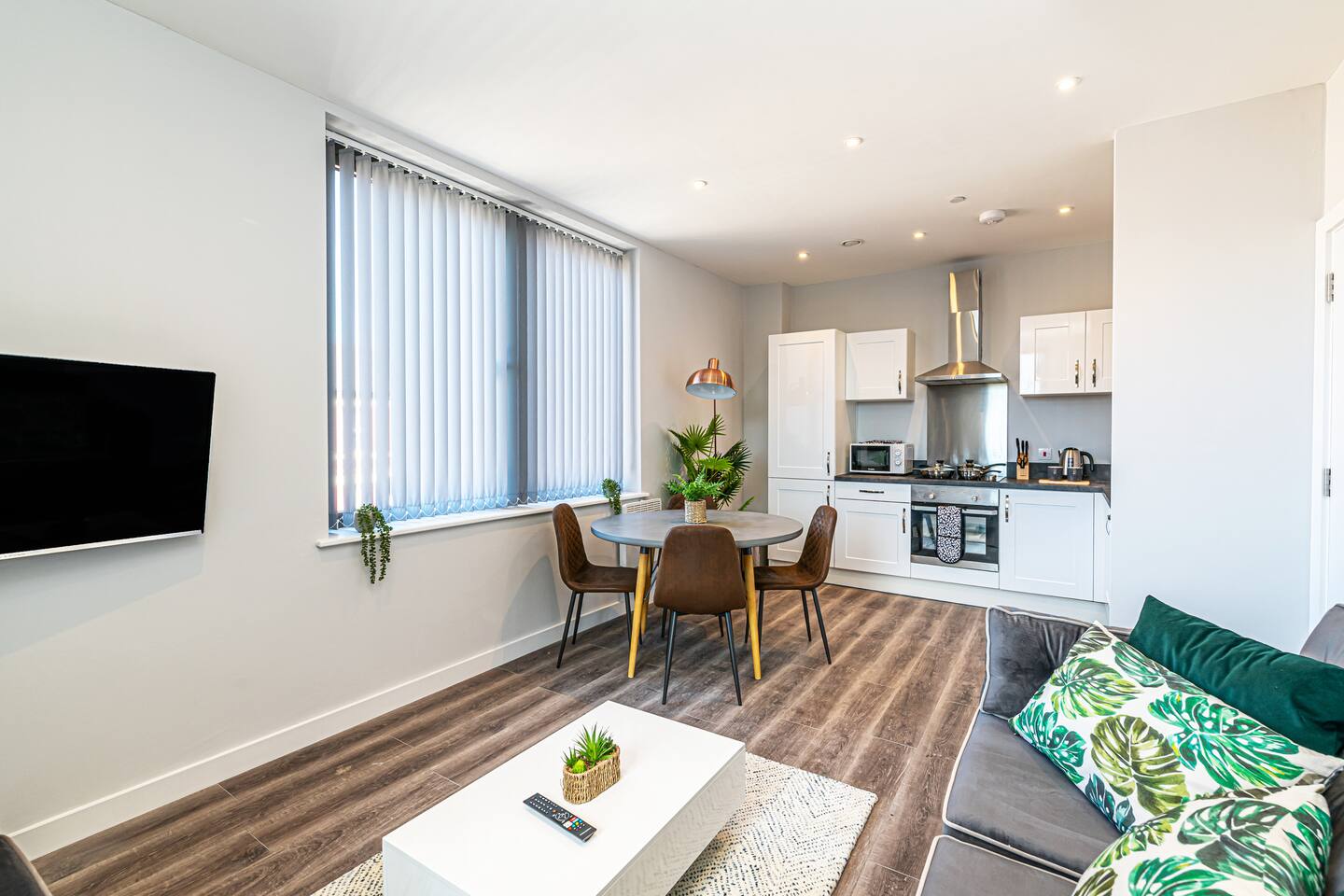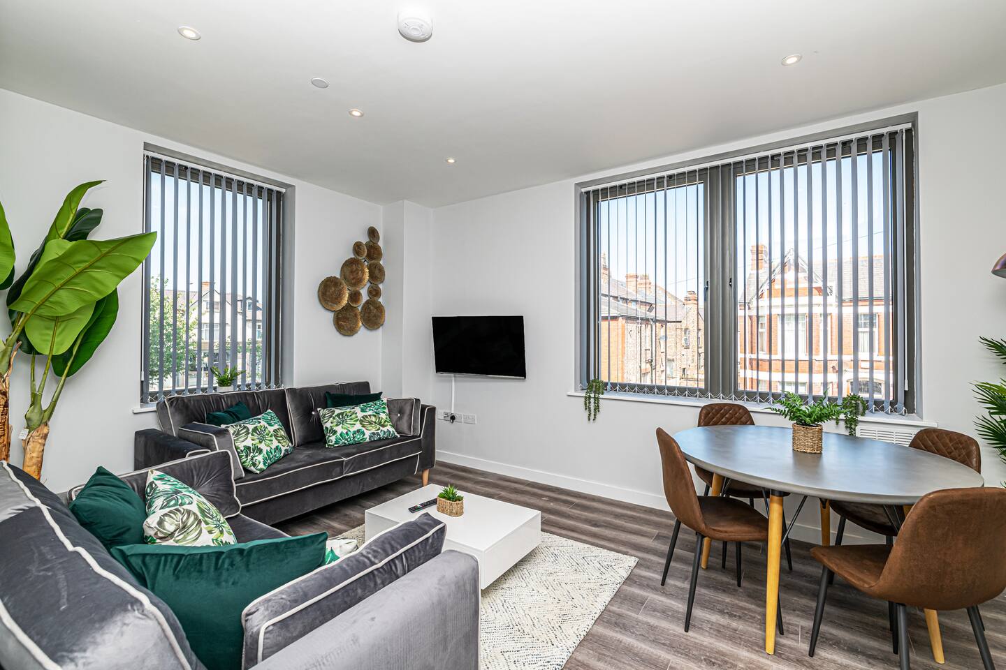 Crosby Gardens Apartment has a beautiful and bright open plan living, kitchen and dining room. The living area boasts carefully selected artwork and pottery to create a warm space. There is plenty of room to sit comfortably with two velvet sofas and an armchair. In the evenings it's the perfect spot to cosy up and watch your favourite shows on the large smart TV. Offering free onsite parking, a convenient lift access and concierge service, you'll love this location and space! After preparing a meal in the modern, well-equipped kitchen, guests can sit around the dining table and socialise with loved ones. There are two generous bedrooms in the apartment offering lots of space and stylish touches. Both bedrooms can be made into a superking sized bed, or two single beds offering convenient options for larger groups.