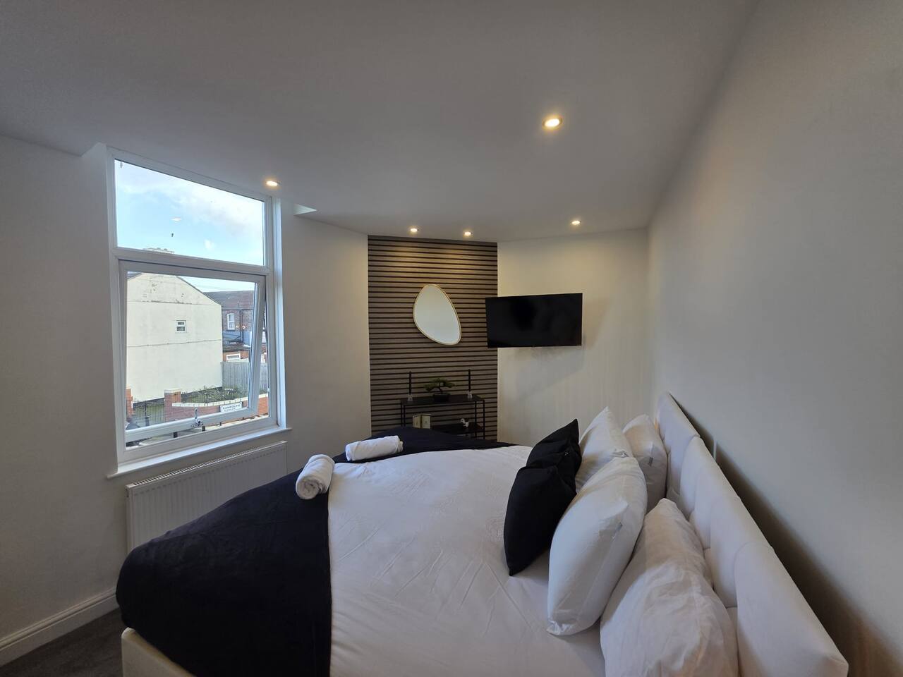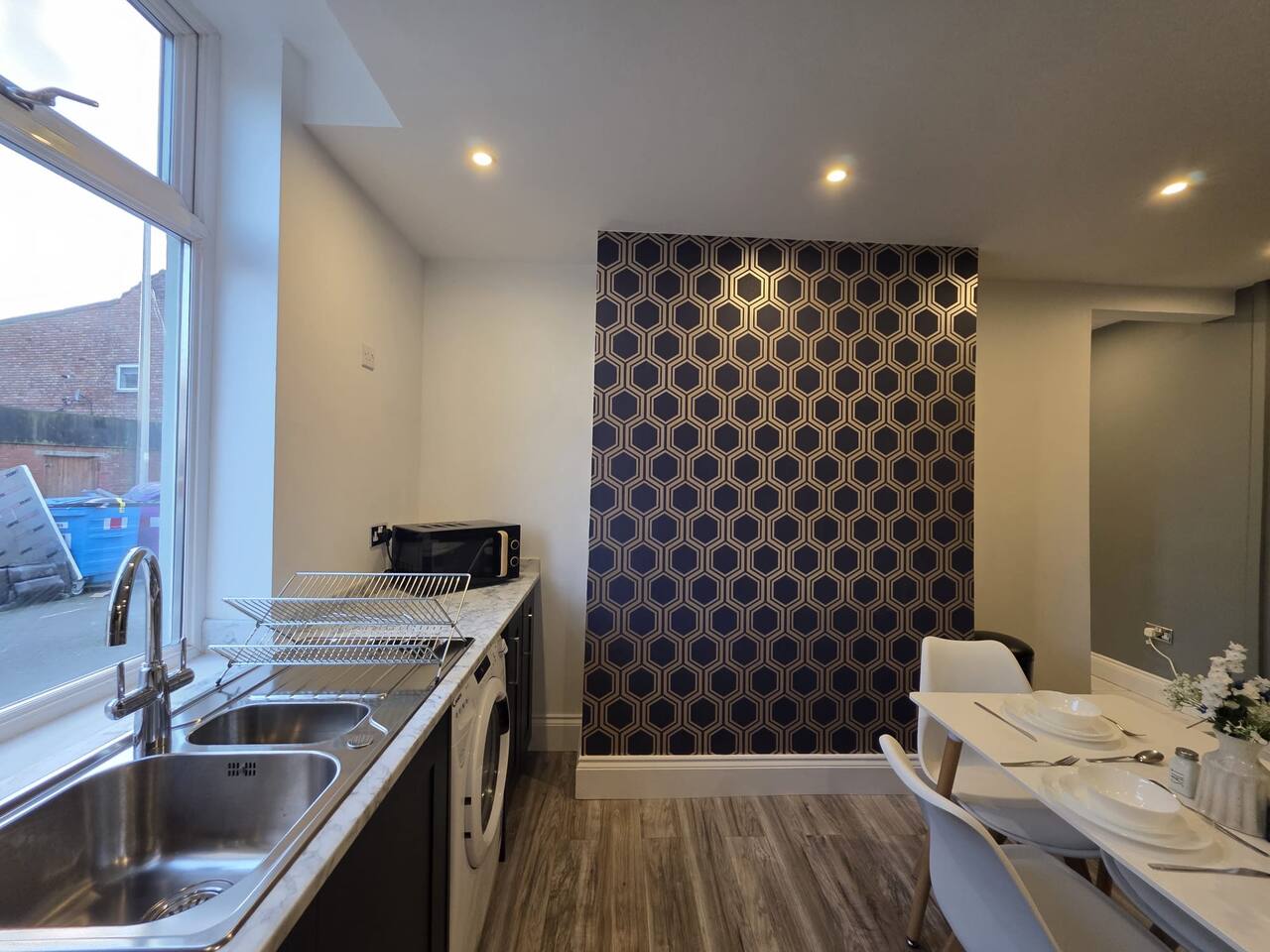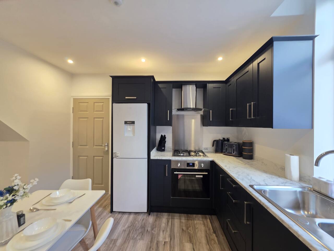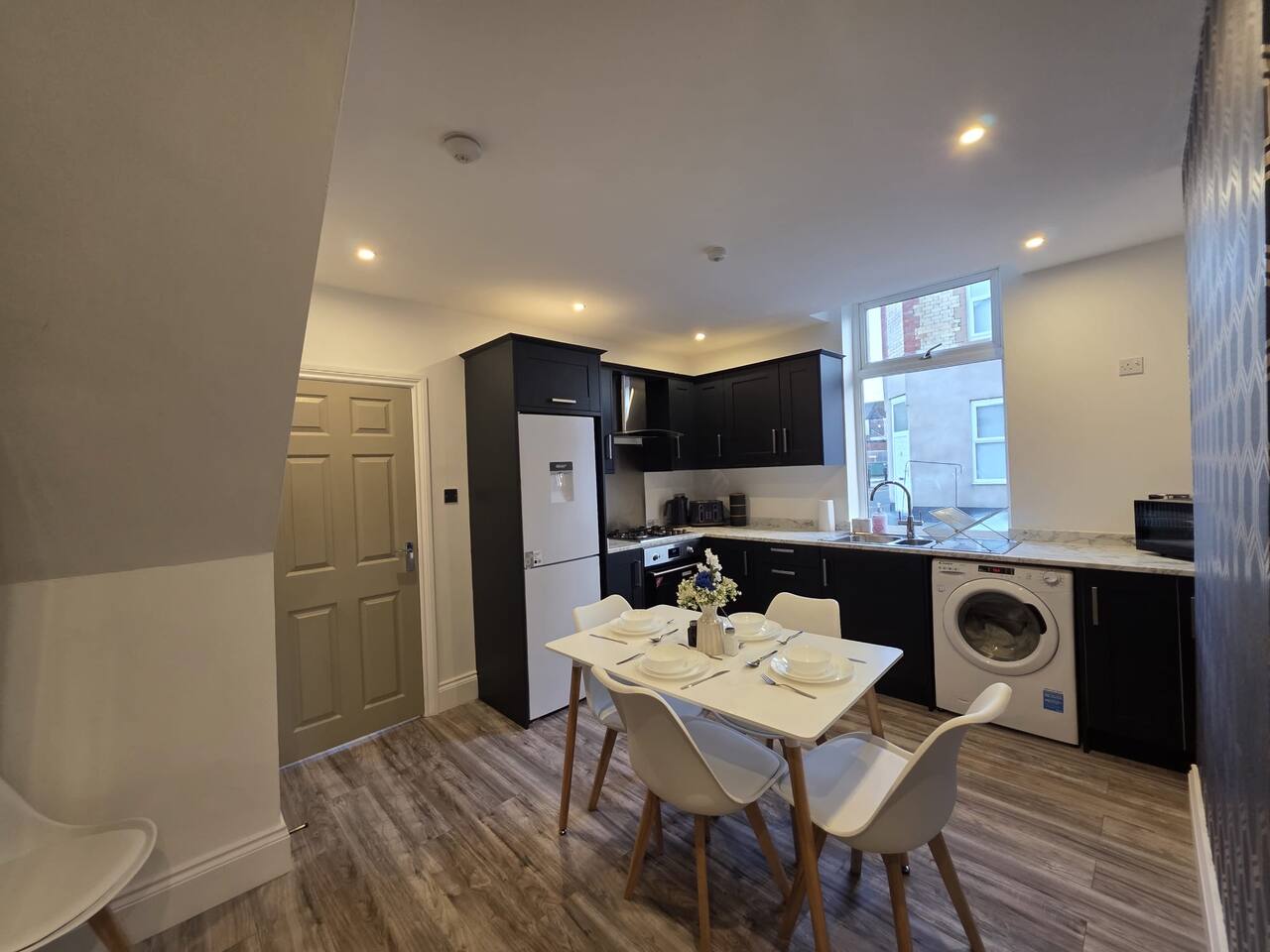 Discount available by following the instructions on the green picture. This retreat is perfect for families or groups keen to experience all Liverpool has to offer. Experience ultimate relaxation at this stunning 4 bedroom home a moment from Anfield Stadium in Liverpool. Perfectly nestled beside the iconic ground, the short distance to the vibrant city provides convenient opportunities to explore from this prime location. We invite you to indulge Liverpool's rich cultural heritage, lively shopping districts, and famous attractions. Step inside and be greeted by the elegance and warmth of our stylishly appointed home. The décor, a perfect mix of contemporary design and cosy ambiance, ensures that your stay is as comfortable as it is luxurious. The living area is carefully designed to relax after exploration and the kitchen caters for a perfect evening meal together. The powerful showers - all three of them will provide a pamper like no other. Our home features three fully tiled, luxurious bathrooms designed to offer a spa-like experience. Refresh under the soothing rainfall showers, or unwind in the main bedroom deep soak tub—your personal oasis for tranquillity and relaxation. Dreamy Nights in Plush Bedrooms Each of our four bedrooms is a sanctuary of comfort, featuring plush linens and cosy beds that promise restful nights. The beds can be king size or singles - you decide! The main bedroom, a luxury suite with a king-size bed and a 43" TV with access to all major streaming sites through the smart TV. Fully-Equipped Kitchen & Modern Amenities Our fully-equipped kitchen is ready to meet all your culinary needs. washing machine Smart home features like Philips Hue lighting and a Hive wireless thermostat allow you to create the perfect ambiance. Stay connected with superfast Wi-Fi throughout the home. Sunlit Garden for Leisure and Entertainment Step outside into our private sun trap patio garden, a perfect spot for a coffee in the morning or a wine in the evening.