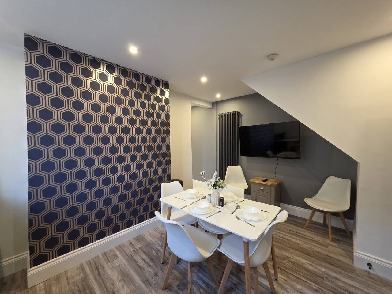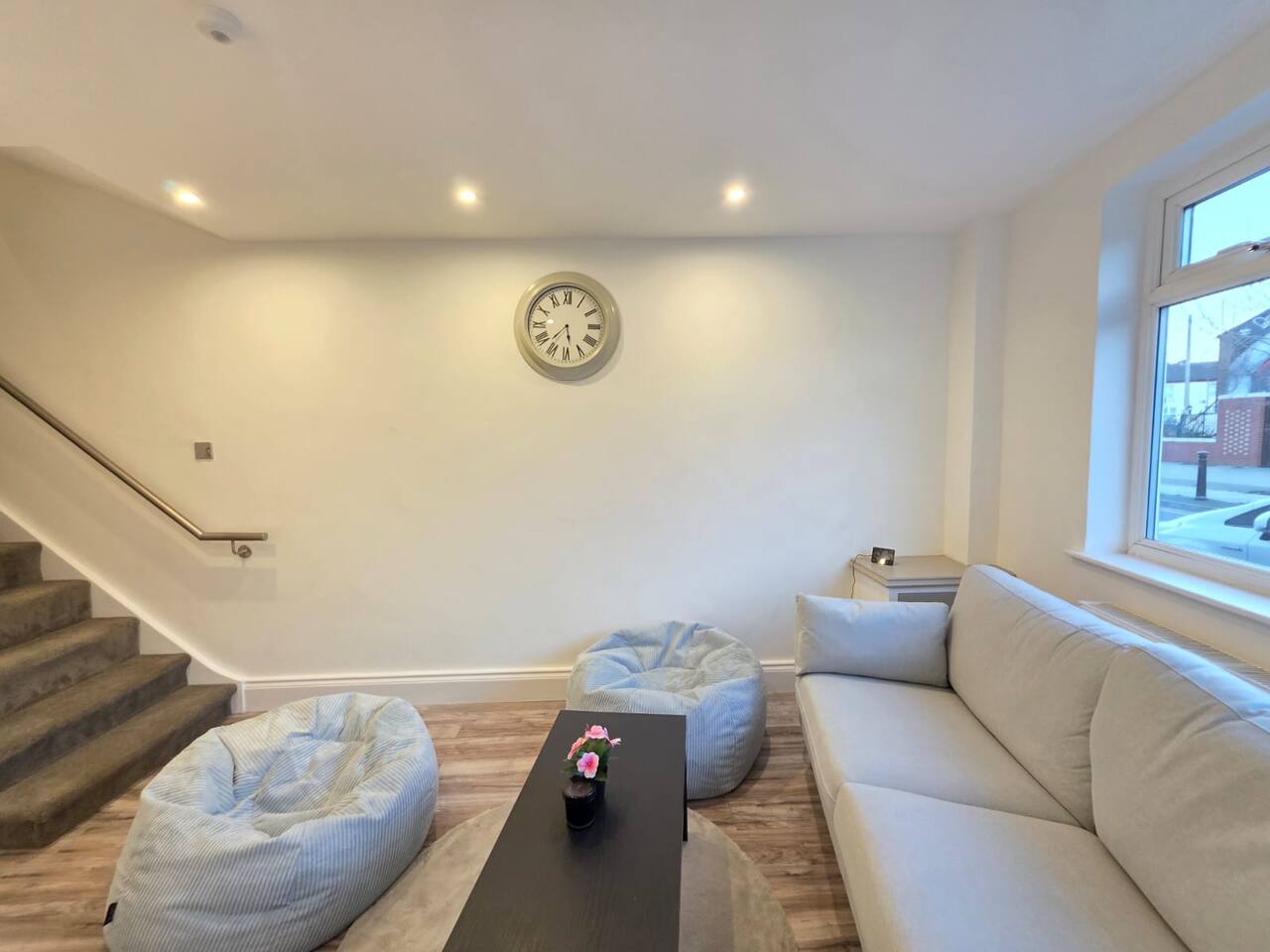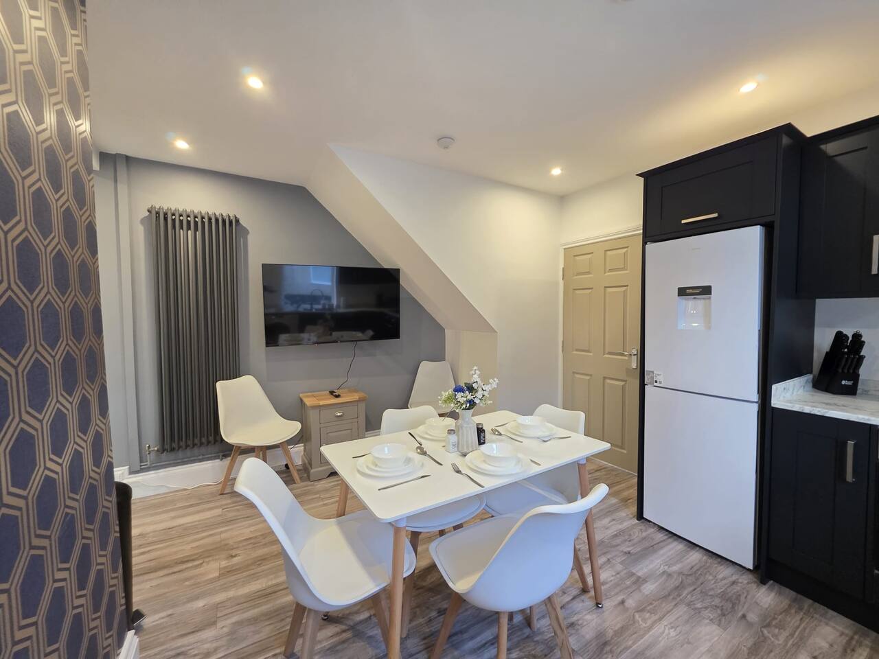 Discount available by following the instructions on the green picture. This retreat is perfect for families or groups keen to experience all Liverpool has to offer. Experience ultimate relaxation at this stunning 4 bedroom home a moment from Anfield Stadium in Liverpool. Perfectly nestled beside the iconic ground, the short distance to the vibrant city provides convenient opportunities to explore from this prime location. We invite you to indulge Liverpool's rich cultural heritage, lively shopping districts, and famous attractions. Step inside and be greeted by the elegance and warmth of our stylishly appointed home. The décor, a perfect mix of contemporary design and cosy ambiance, ensures that your stay is as comfortable as it is luxurious. The living area is carefully designed to relax after exploration and the kitchen caters for a perfect evening meal together. The powerful showers - all three of them will provide a pamper like no other. Our home features three fully tiled, luxurious bathrooms designed to offer a spa-like experience. Refresh under the soothing rainfall showers, or unwind in the main bedroom deep soak tub—your personal oasis for tranquillity and relaxation. Dreamy Nights in Plush Bedrooms Each of our four bedrooms is a sanctuary of comfort, featuring plush linens and cosy beds that promise restful nights. The beds can be king size or singles - you decide! The main bedroom, a luxury suite with a king-size bed and a 43" TV with access to all major streaming sites through the smart TV. Fully-Equipped Kitchen & Modern Amenities Our fully-equipped kitchen is ready to meet all your culinary needs. washing machine Smart home features like Philips Hue lighting and a Hive wireless thermostat allow you to create the perfect ambiance. Stay connected with superfast Wi-Fi throughout the home. Sunlit Garden for Leisure and Entertainment Step outside into our private sun trap patio garden, a perfect spot for a coffee in the morning or a wine in the evening.