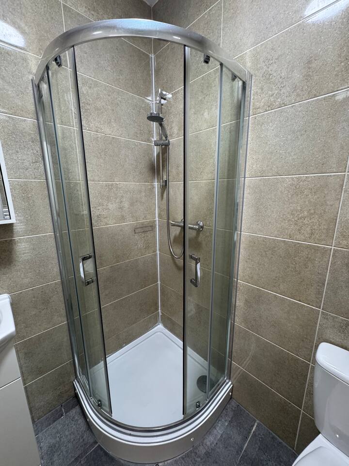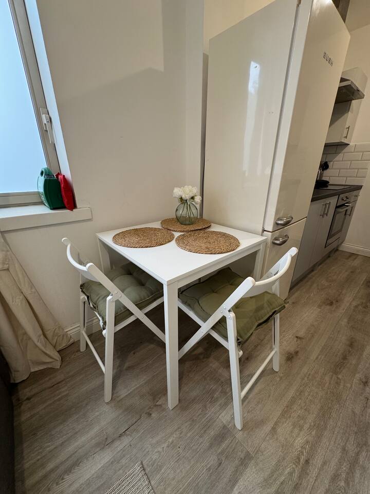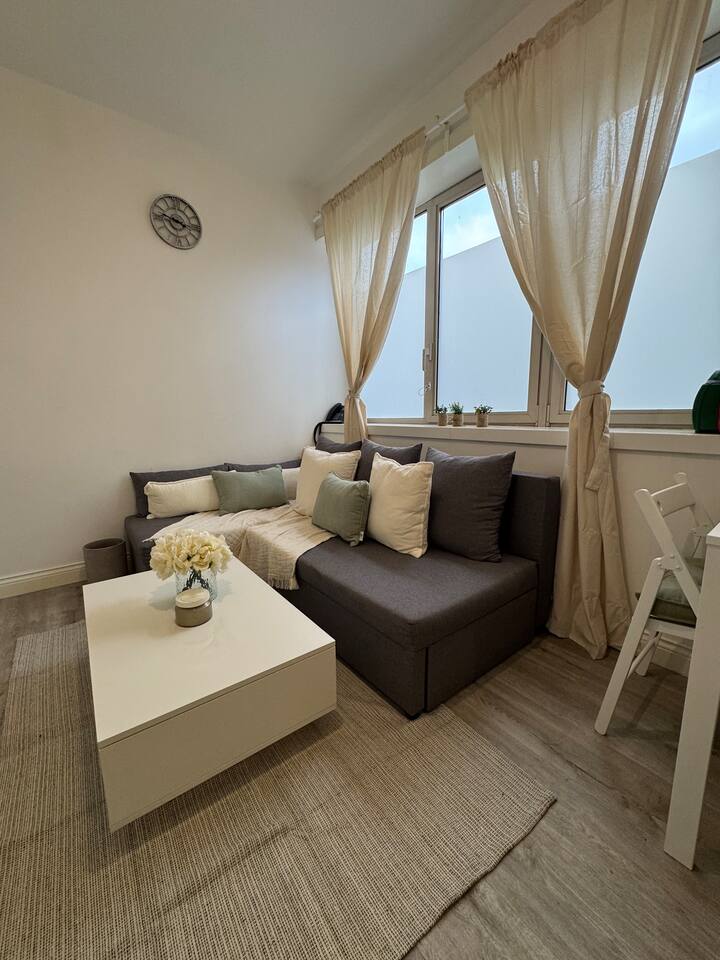 Bringing more people? More apartments available. Send us a message to find out more. Everything - all on one level: This apartment is the ideal spot for travellers who seek comfort and practicality. A light and bright apartment boasting large windows, with a double bed, a desk/working space, a large sofa-bed - all connected to a full kitchen with an oven, hob, microwave plus all the necessities to cook a meal. You'll find everything you need to relax here. The bathroom houses a powerful shower enclosed in a shower cubicle, alongside the toilet and sink. Comfort has been prioritised along with style and convenience. A true home from home experience.