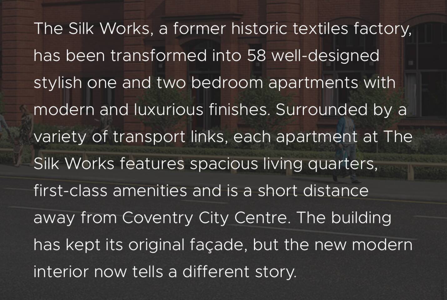 Transport links: Bus stop to city outside the Silkworks development Attractions: Coombe Abbey Coventry Cathedral Coventry City Centre The War Memorial park