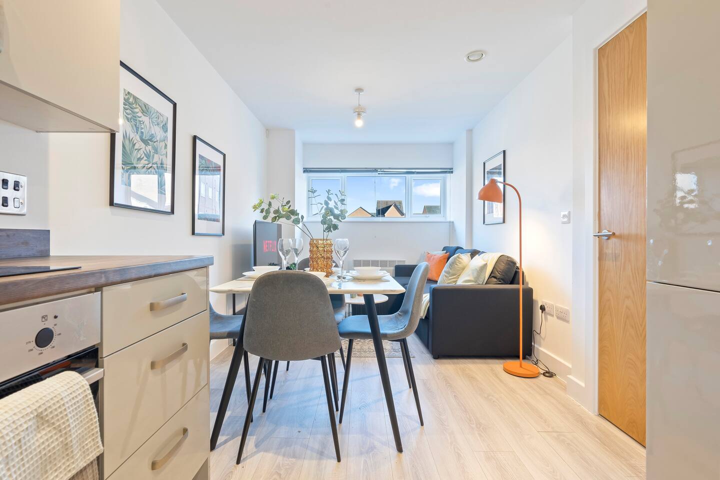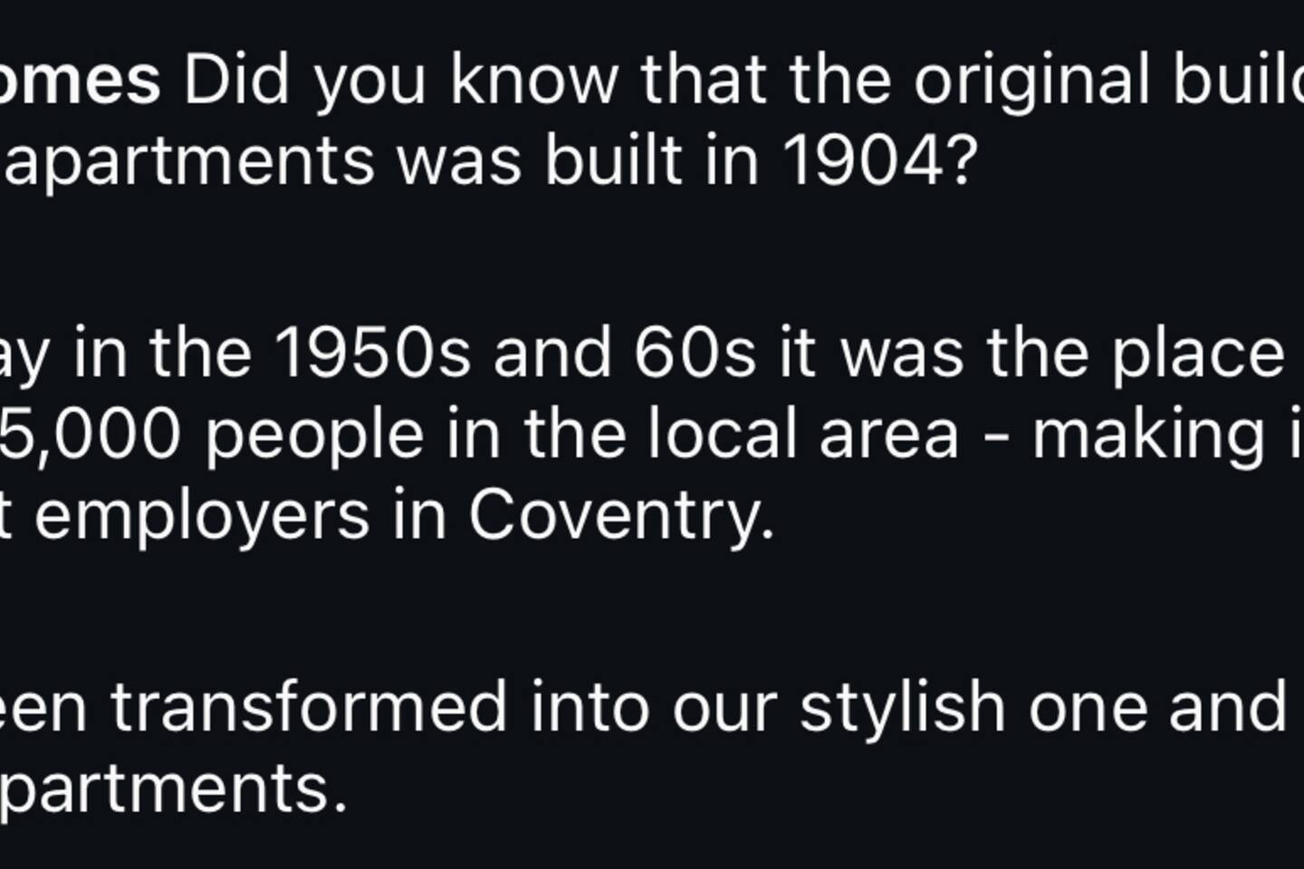 Welcome to the famous 19th century Silkwork factory Grade 2 listed building, built by the Cash Family who created silk garments for 138 years. Above rows of weavers' cottages, the brothers created an upper storey with well-lit work areas housing jacquard looms powered by a central beam engine. These were the famous Cash's Topshops and the prizewinning silk ribbons woven there were used on the prettiest gowns, to the delight of fashionable society ladies. Now transformed into luxurious apartments, surrounded by a variety of transport links. The apartment features attractive living quarters first class amenities and is a short distance away from Coventry City Centre. Take a leisurely walk along the canal into the city which takes around 20 minutes. You have the opportunity to stay in this incredible piece of Coventry's rich history. The space: You'll have the most wonderful night sleep in quality king and double beds and soft linen, with an en-suite attached to the master bedroom. There's so much opportunity for relaxation. 🧘♂️ The stylish open plan living area is perfect for the feeling of togetherness, relaxing on a large sofa or dining at a comfortable table. The "Symphony Kitchen" tiled by Porcelanosa includes: Integrated Zanussi Washer Dryer, Integrated Zanussi Fridge Freezer Integrated Zanussi Stainless steel oven Integrated Zanussi induction hob Integrated Zanussi steel cooker hood. The modern bathrooms each contain a power shower and crafted bathroom suites. Cultural highlights of Coventry. Uk city of culture 2021. Local attractions: Coventry Transport Museum: Home to the world's two fastest cars, and hosts interactive exhibitions for schools The Herbert Art Gallery & Museum: A cultural destination in Coventry Ring Road Poem: Britain's first two-mile-long poem, written on Coventry's Ring Road Streets of Cultures: A celebration of Coventry's neighborhoods through poetry, line dancing, and dinners Shakespeare Film Screenings: The Royal Shakespeare Company performed a year-long program of events in the city City of Culture 2021 Focused on inclusion and diversity Encouraged activism, civic participation, and digital innovation Improved sustainability, tourism, and heritage Coombe Abbey